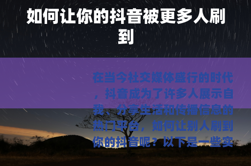 在当今社交媒体盛行的时代,抖音成为了许多人展示自我、分享生活和传播信息的热门平台,如何让别人刷到你的抖音呢?以下是一些实用的方法。