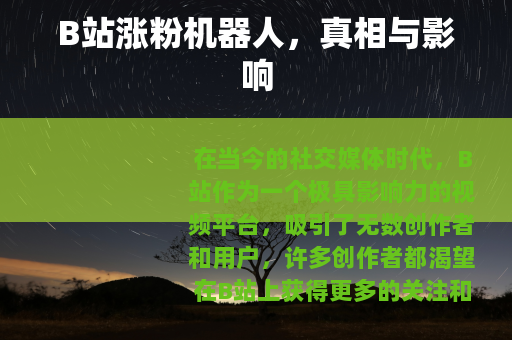 在当今的社交媒体时代,B站作为一个极具影响力的视频平台,吸引了无数创作者和用户,许多创作者都渴望在B站上获得更多的关注和粉丝,以扩大自己的影响力和创作价值,而在这个过程中,一种名为B站涨粉机器人的现象逐渐进入了人们的视野。