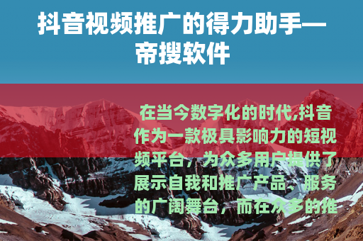 在当今数字化的时代,抖音作为一款极具影响力的短视频平台,为众多用户提供了展示自我和推广产品、服务的广阔舞台,而在众多的推广工具中,帝搜软件脱颖而出,成为了抖音视频推广的首选。