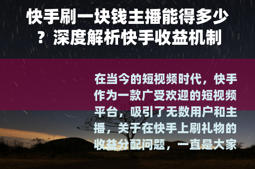 在当今的短视频时代,快手作为一款广受欢迎的短视频平台,吸引了无数用户和主播,关于在快手上刷礼物的收益分配问题,一直是大家比较关注的焦点,比如很多人都想知道快手刷一块钱主播能得多少。
