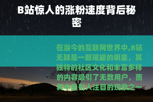 在当今的互联网世界中,B站无疑是一颗璀璨的明星,其独特的社区文化和丰富多样的内容吸引了无数用户,而其中最引人注目的现象之一,便是那令人咋舌的涨粉速度。