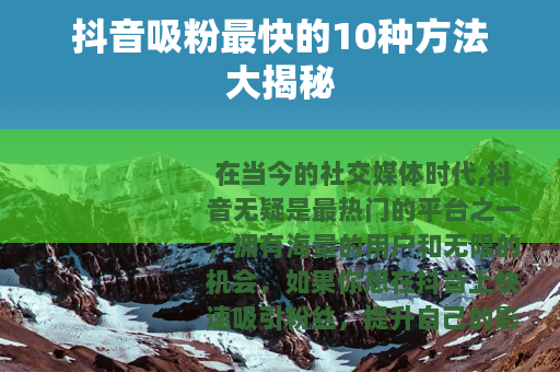 在当今的社交媒体时代,抖音无疑是最热门的平台之一,拥有海量的用户和无限的机会,如果你想在抖音上快速吸引粉丝,提升自己的影响力,那么以下这10种方法或许能助你一臂之力。