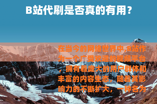 在当今的网络世界中,B站作为一个广受欢迎的视频平台,拥有着庞大的用户群体和丰富的内容生态,随着其影响力的不断扩大,一种名为B站代刷的现象也逐渐进入了人们的视野,B站代刷到底有用吗?这是一个值得深入探讨的问题。