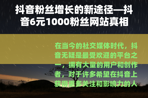 在当今的社交媒体时代,抖音无疑是最受欢迎的平台之一,拥有大量的用户和创作者,对于许多希望在抖音上获得更多关注和影响力的人来说,粉丝数量的增长是一个关键目标,而市场上也出现了各种各样声称可以帮助快速增加抖音粉丝的服务,其中就包括一些所谓的抖音6元1000粉丝网站。
