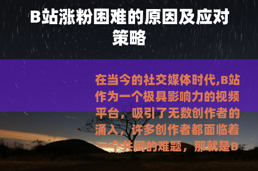 在当今的社交媒体时代,B站作为一个极具影响力的视频平台,吸引了无数创作者的涌入,许多创作者都面临着一个共同的难题,那就是B站涨粉很困难。