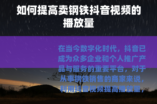 通过以上这些方法的综合运用,卖钢铁的抖音视频就有更大的机会提高播放量,在抖音平台上获得更多的关注和商机,助力钢铁销售业务的发展。