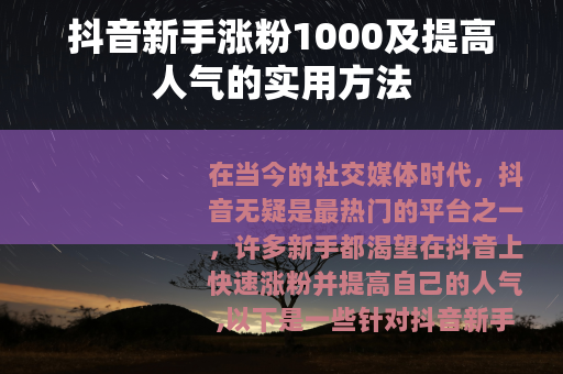 在当今的社交媒体时代,抖音无疑是最热门的平台之一,许多新手都渴望在抖音上快速涨粉并提高自己的人气,以下是一些针对抖音新手涨粉1000及提高人气的有效方法。