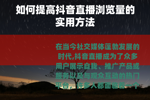 在当今社交媒体蓬勃发展的时代,抖音直播成为了众多用户展示自我、推广产品或服务以及与观众互动的热门平台,许多人都面临着一个共同的问题,那就是如何提高抖音直播的浏览量,以下是一些切实可行的方法,帮助你在抖音直播中吸引更多的观众,提升浏览量。