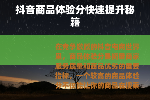 在竞争激烈的抖音电商世界里,商品体验分是衡量商家服务质量和商品优劣的重要指标,一个较高的商品体验分不仅能让你的商品在搜索结果中更具优势,还能增加消费者的信任感,从而提高店铺的销量和口碑,如何快速提高抖音商品体验分呢?以下是一些实用的方法。