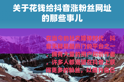 在当今的社交媒体时代,抖音无疑是最热门的平台之一,拥有大量的用户和创作者,许多人都渴望在抖音上获得更多的粉丝,以提升自己的影响力和知名度,市场上出现了各种各样声称可以花钱给抖音涨粉丝的网址。