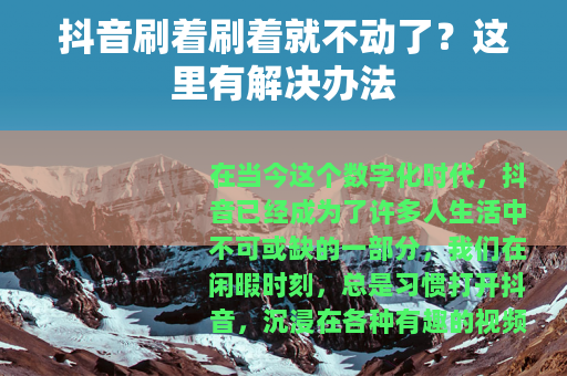 在当今这个数字化时代,抖音已经成为了许多人生活中不可或缺的一部分,我们在闲暇时刻,总是习惯打开抖音,沉浸在各种有趣的视频内容中,有时候我们会遇到这样一个让人烦恼的情况:抖音刷着刷着就不动了,这究竟是怎么回事呢?