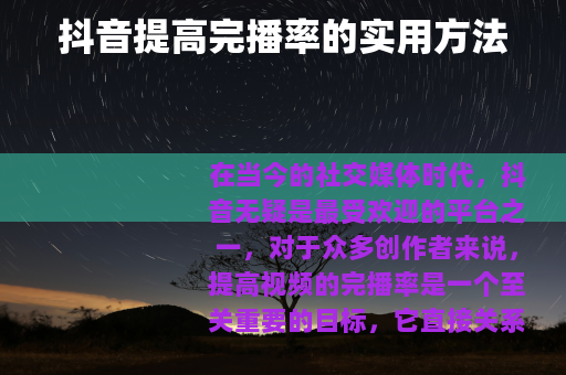在当今的社交媒体时代,抖音无疑是最受欢迎的平台之一,对于众多创作者来说,提高视频的完播率是一个至关重要的目标,它直接关系到视频的传播效果和账号的发展,抖音怎么提高完播率呢?以下是一些实用的方法。 要具有吸引力,在创作视频时,要确保主题明确且有趣,能够迅速抓住用户的注意力,可以选择当下热门的话题,或者是一些独特的、能引发用户好奇心的题材,通过一个精彩的开头,如一个有趣的场景、一句引人深思的话或一个令人惊叹的画面,让用户产生继续观看的欲望。