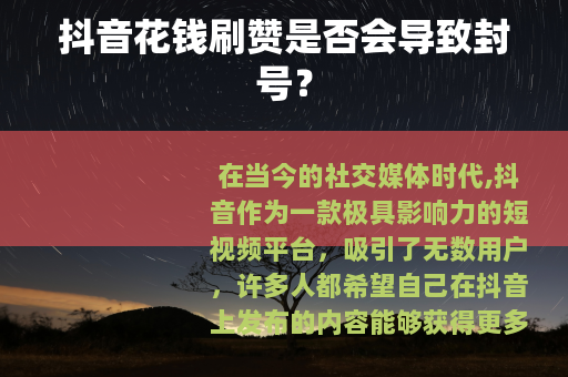在当今的社交媒体时代,抖音作为一款极具影响力的短视频平台,吸引了无数用户,许多人都希望自己在抖音上发布的内容能够获得更多的点赞,从而获得更高的曝光度和关注度,一个问题便应运而生:抖音花钱刷赞会封号吗?
