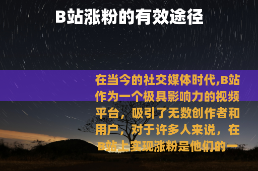 在当今的社交媒体时代,B站作为一个极具影响力的视频平台,吸引了无数创作者和用户,对于许多人来说,在B站上实现涨粉是他们的一个重要目标,那么有哪些有效的途径可以帮助我们在B站涨粉呢? 质量是关键,创作者需要提供有价值、有趣、独特的视频内容,无论是搞笑的段子、专业的知识讲解,还是精彩的生活记录,都要确保能够吸引观众的眼球并让他们产生共鸣,只有当观众喜欢你的内容,他们才会愿意关注你,成为你的粉丝。