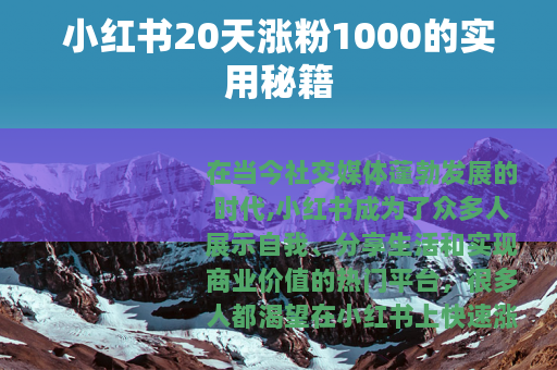 在当今社交媒体蓬勃发展的时代,小红书成为了众多人展示自我、分享生活和实现商业价值的热门平台,很多人都渴望在小红书上快速涨粉,今天就来给大家分享一些能在20天内让小红书账号涨粉1000的有效方法。