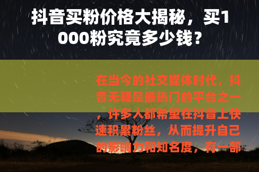 在当今的社交媒体时代,抖音无疑是最热门的平台之一,许多人都希望在抖音上快速积累粉丝,从而提升自己的影响力和知名度,有一部分人会考虑通过购买粉丝的方式来实现粉丝量的快速增长,抖音买1000粉多少钱呢?