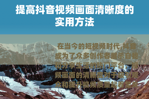 在当今的短视频时代,抖音成为了众多创作者展示自我和分享生活的热门平台,视频画面的清晰度对于吸引观众和提升视频质量起着至关重要的作用,抖音视频怎么提高画面清晰度呢?以下是一些实用的方法。