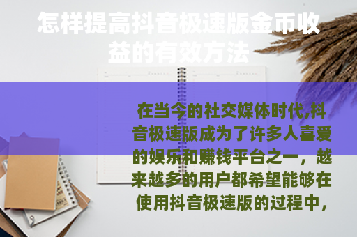 在当今的社交媒体时代,抖音极速版成为了许多人喜爱的娱乐和赚钱平台之一,越来越多的用户都希望能够在使用抖音极速版的过程中,提高自己的金币收益,以下是一些可以帮助你提高抖音极速版金币收益的实用方法。
