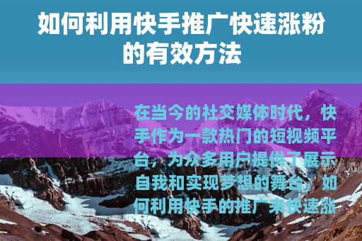 在当今的社交媒体时代,快手作为一款热门的短视频平台,为众多用户提供了展示自我和实现梦想的舞台,如何利用快手的推广来快速涨粉呢?以下是一些实用的方法。
