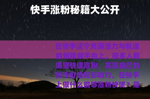 在快手这个充满活力与机遇的短视频平台上,很多人都渴望快速涨粉,实现自己的创作价值和影响力,在快手上做什么能够涨粉快呢? 是涨粉的关键,无论是搞笑幽默的段子、感人至深的故事,还是实用的知识技能分享,只要能真正触动观众的内心,引发他们的共鸣和兴趣,就有机会吸引大量粉丝,一些美食博主通过展示独特的美食制作过程,不仅让观众垂涎欲滴,还能学到烹饪技巧,从而获得了众多粉丝的喜爱与关注。