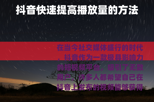 在当今社交媒体盛行的时代,抖音作为一款极具影响力的短视频平台,吸引了无数用户,许多人都希望自己在抖音上发布的视频能够获得更高的播放量,从而扩大自己的影响力和知名度,抖音怎样才能快速提高播放速度呢? 的质量是至关重要的,一个有趣、有价值、有创意的视频往往更容易吸引用户的关注,在制作视频时,要确保内容新颖独特,能够满足用户的某种需求或兴趣点,可以分享一些实用的生活小技巧、精彩的才艺表演、搞笑的段子或者是引人深思的观点等,视频的画面要清晰、稳定,音频也要清晰无杂音,这样才能给用户带来良好的观看体验。