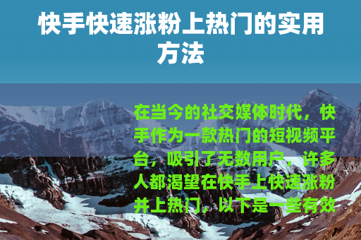 在当今的社交媒体时代,快手作为一款热门的短视频平台,吸引了无数用户,许多人都渴望在快手上快速涨粉并上热门,以下是一些有效的方法可以帮助你实现这一目标。 质量是关键,要确保你的视频内容具有独特性和吸引力,可以从自己的兴趣爱好、专业技能或生活中的趣事入手,制作出能引起观众共鸣的视频,如果你擅长烹饪,那么可以制作一系列精美的美食制作视频,详细展示每一个步骤和独特的烹饪技巧,让观众在观看过程中不仅能学到知识,还能感受到美食的魅力,从而吸引他们关注你的账号。