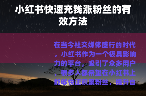 在当今社交媒体盛行的时代,小红书作为一个极具影响力的平台,吸引了众多用户,很多人都希望在小红书上能够快速积累粉丝,提升自己的影响力,通过合理充钱的方式来加快涨粉速度是一种常见的策略,下面就为大家介绍一些小红书充钱涨粉丝快的方法。