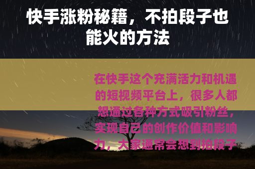 在快手这个充满活力和机遇的短视频平台上,很多人都想通过各种方式吸引粉丝,实现自己的创作价值和影响力,大家通常会想到拍段子来博眼球、涨粉,但如果你觉得自己不太擅长拍段子,也不必担心,因为还有很多其他途径可以让你在快手上收获大量粉丝。