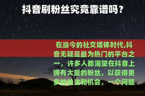 在当今的社交媒体时代,抖音无疑是最为热门的平台之一,许多人都渴望在抖音上拥有大量的粉丝,以获得更多的关注和机会,一个问题便应运而生:抖音刷粉丝靠谱不?