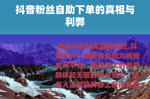 在当今的社交媒体时代,抖音作为一款极具影响力的短视频平台,拥有庞大的用户群体和无限的商业潜力,许多人渴望在抖音上获得更多的关注和粉丝,以实现自己的创作梦想或商业目标,抖音粉丝自助下单服务应运而生,成为了一个备受关注的话题。