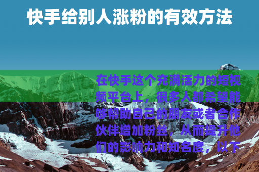 通过以上这些方法的综合运用,就能够在快手上有效地帮助别人涨粉,提升他们在平台上的影响力和知名度,让他们在快手的世界里拥有更多的关注和支持。