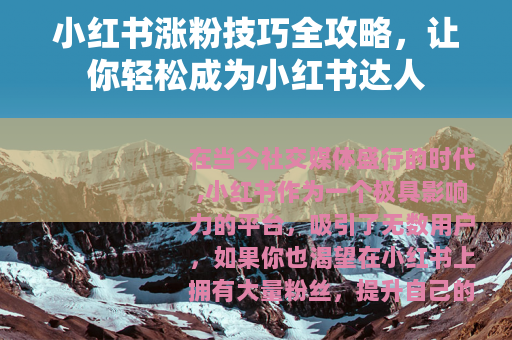 在当今社交媒体盛行的时代,小红书作为一个极具影响力的平台,吸引了无数用户,如果你也渴望在小红书上拥有大量粉丝,提升自己的影响力,那么这篇小红书涨粉技巧全攻略将为你提供全面的指导。