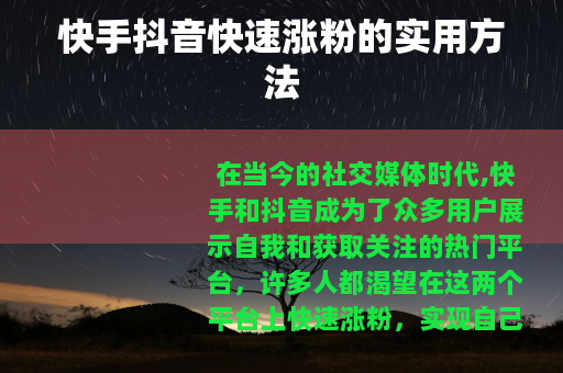 在当今的社交媒体时代,快手和抖音成为了众多用户展示自我和获取关注的热门平台,许多人都渴望在这两个平台上快速涨粉,实现自己的社交和商业价值,以下是一些在快手抖音上快速涨粉的有效方法。 质量是关键,无论是搞笑、美食、美妆还是知识分享等各种类型的视频,都要确保内容具有独特性和吸引力,在美食领域,可以分享一些独特的地方美食制作过程,或者是对经典美食的创新做法,让观众在观看视频后能够获得有价值的信息或产生愉悦的心情,视频的画面要清晰,剪辑要流畅,声音也要清晰可听,这样才能给观众带来良好的观看体验,从而增加粉丝的留存率。