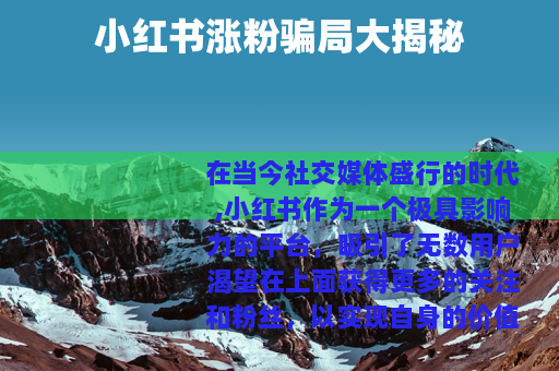 在当今社交媒体盛行的时代,小红书作为一个极具影响力的平台,吸引了无数用户渴望在上面获得更多的关注和粉丝,以实现自身的价值或商业目标,伴随着这种需求的增长,小红书涨粉骗局也日益猖獗,让许多不明就里的用户陷入其中,遭受损失。