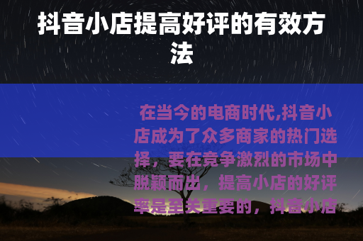 在当今的电商时代,抖音小店成为了众多商家的热门选择,要在竞争激烈的市场中脱颖而出,提高小店的好评率是至关重要的,抖音小店好评究竟该怎么提高呢?以下是一些实用的方法。