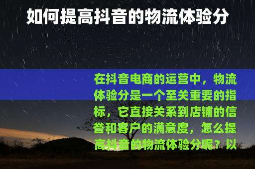 在抖音电商的运营中,物流体验分是一个至关重要的指标,它直接关系到店铺的信誉和客户的满意度,怎么提高抖音的物流体验分呢?以下是一些实用的方法。