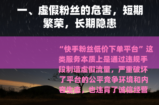 “快手粉丝低价下单平台”这类服务本质上是通过违规手段制造虚假流量,严重破坏了平台的公平竞争环境和内容生态,也违背了诚信经营的基本原则,以下从几个角度分析其危害性及正确的发展路径: