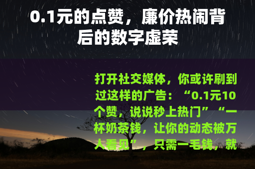 打开社交媒体,你或许刷到过这样的广告:“0.1元10个赞,说说秒上热门”“一杯奶茶钱,让你的动态被万人看见”,只需一毛钱,就能给沉寂的说说添上几个甚至几十个点赞——这种“廉价的热闹”,正在年轻人的圈子里悄然蔓延。
