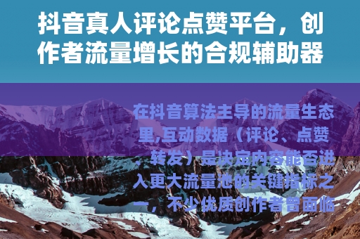 在抖音算法主导的流量生态里,互动数据(评论、点赞、转发)是决定内容能否进入更大流量池的关键指标之一,不少优质创作者曾面临这样的困境:内容质量上乘,却因初期评论区冷清、点赞量低迷,陷入“酒香怕巷子深”的尴尬。抖音真人评论点赞平台作为一种合规辅助工具,逐渐走进创作者的视野——它并非“刷量神器”,而是通过真实用户的自然互动,帮助优质内容突破冷启动瓶颈,获得算法的青睐。