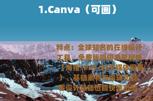 特点:全球知名的在线设计工具,免费版提供海量模板(海报/PPT/社交媒体图等)、基础素材与编辑功能,零设计基础也能快速出图,日常做图需求完全满足。