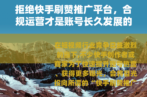 在短视频行业竞争日益激烈的当下,不少快手创作者或商家为了快速提升账号热度、获得更多曝光,会将目光投向所谓的“快手刷赞推广平台”,这类平台不仅违背平台规则,更会对账号的长期发展埋下隐患,真正的账号成长,从来都不是靠虚假数据堆砌,而是建立在优质内容、合规运营与真诚互动的基础上。