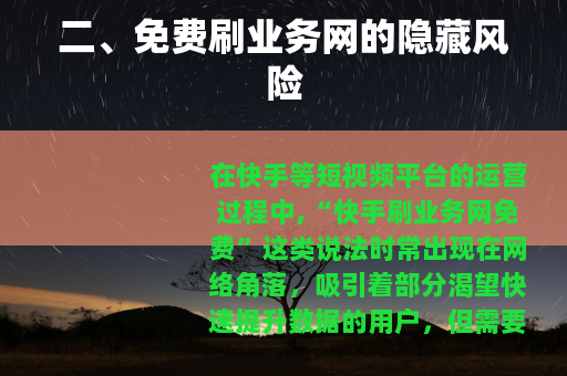 在快手等短视频平台的运营过程中,“快手刷业务网免费”这类说法时常出现在网络角落,吸引着部分渴望快速提升数据的用户,但需要明确的是:任何形式的“刷业务”行为,本质上都是对平台规则的破坏,且所谓“免费”背后往往隐藏着多重风险,绝非账号发展的可持续路径。
