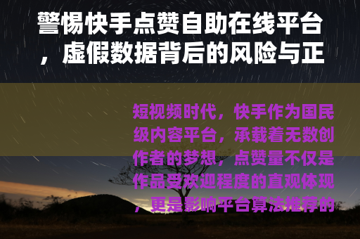 短视频时代,快手作为国民级内容平台,承载着无数创作者的梦想,点赞量不仅是作品受欢迎程度的直观体现,更是影响平台算法推荐的关键指标——高点赞意味着更多曝光机会,能让创作者快速积累粉丝、实现商业价值,在这种需求驱动下,“快手点赞自助在线平台”悄然兴起,声称能“一键提升点赞数”“快速上热门”,吸引了不少急于求成的创作者,这类平台真的能帮创作者实现目标吗?其背后隐藏的风险,远比想象中更值得警惕。