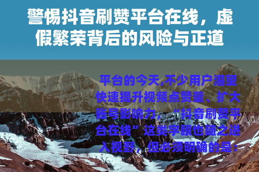 “抖音刷赞平台在线”看似是快速提升数据的捷径,实则是通往账号危机的歧途,真正的影响力,从来不是靠虚假数据堆砌的,而是靠优质内容和真实互动赢得的,与其追求短暂的虚假繁荣,不如坚守诚信原则,用匠心创作打动用户——这才是在抖音平台立足的长久之道。