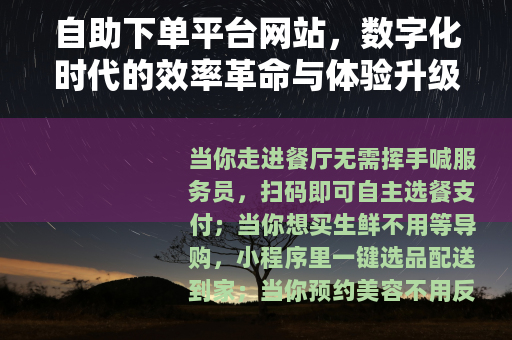 当你走进餐厅无需挥手喊服务员,扫码即可自主选餐支付;当你想买生鲜不用等导购,小程序里一键选品配送到家;当你预约美容不用反复电话确认,平台上直接挑选项目、锁定时间……自助下单平台网站已渗透到生活的方方面面,成为连接商家与用户的“无形桥梁”,更掀起了一场覆盖全行业的效率与体验变革。
