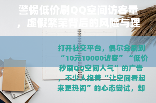 打开社交平台,偶尔会刷到“10元10000访客”“低价秒刷QQ空间人气”的广告,不少人抱着“让空间看起来更热闹”的心态尝试,却忽略了这看似“性价比高”的操作,藏着诸多隐患。