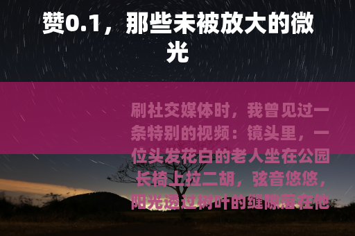 刷社交媒体时,我曾见过一条特别的视频:镜头里,一位头发花白的老人坐在公园长椅上拉二胡,弦音悠悠,阳光透过树叶的缝隙落在他微颤的手指上,视频的播放量不足百次,点赞数只有1——评论区空无一人,仿佛这片旋律只属于他和偶尔驻足的风,我盯着那个孤零零的赞,忽然觉得,它像极了生活里那些被忽略的“赞0.1”:微小到几乎可以忽略,却藏着最真实的温度。