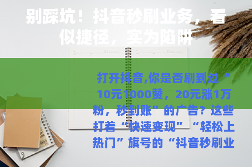 打开抖音,你是否刷到过“10元1000赞,20元涨1万粉,秒到账”的广告?这些打着“快速变现”“轻松上热门”旗号的“抖音秒刷业务”,正在悄悄收割急于求成的创作者——但你知道吗?这条“捷径”背后,藏着足以摧毁账号的深坑。