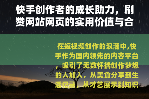 对于快手创作者而言,刷赞网站网页的价值在于它提供了一种可能性:让那些被埋没的优质内容有机会走到台前,在这个信息爆炸的时代,好内容需要被看见的机会,而刷赞工具正是为这种机会提供了助力,但我们也要明白,工具只是手段,不是目的,创作者的核心竞争力永远是内容本身,只有将工具与优质内容相结合,才能在快手平台上走得更远、更稳。