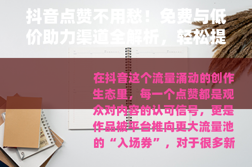 在抖音这个流量涌动的创作生态里,每一个点赞都是观众对内容的认可信号,更是作品被平台推向更大流量池的“入场券”,对于很多新手创作者而言,如何高效获取点赞、突破冷启动阶段,是绕不开的话题——而“免费”与“低价”,则是大家最关注的关键词,我们就来聊聊那些既靠谱又实惠的点赞助力方式,帮你用最小的成本撬动最大的曝光。